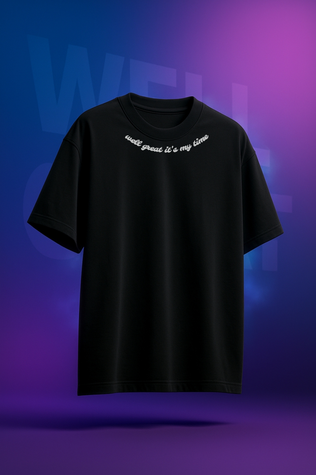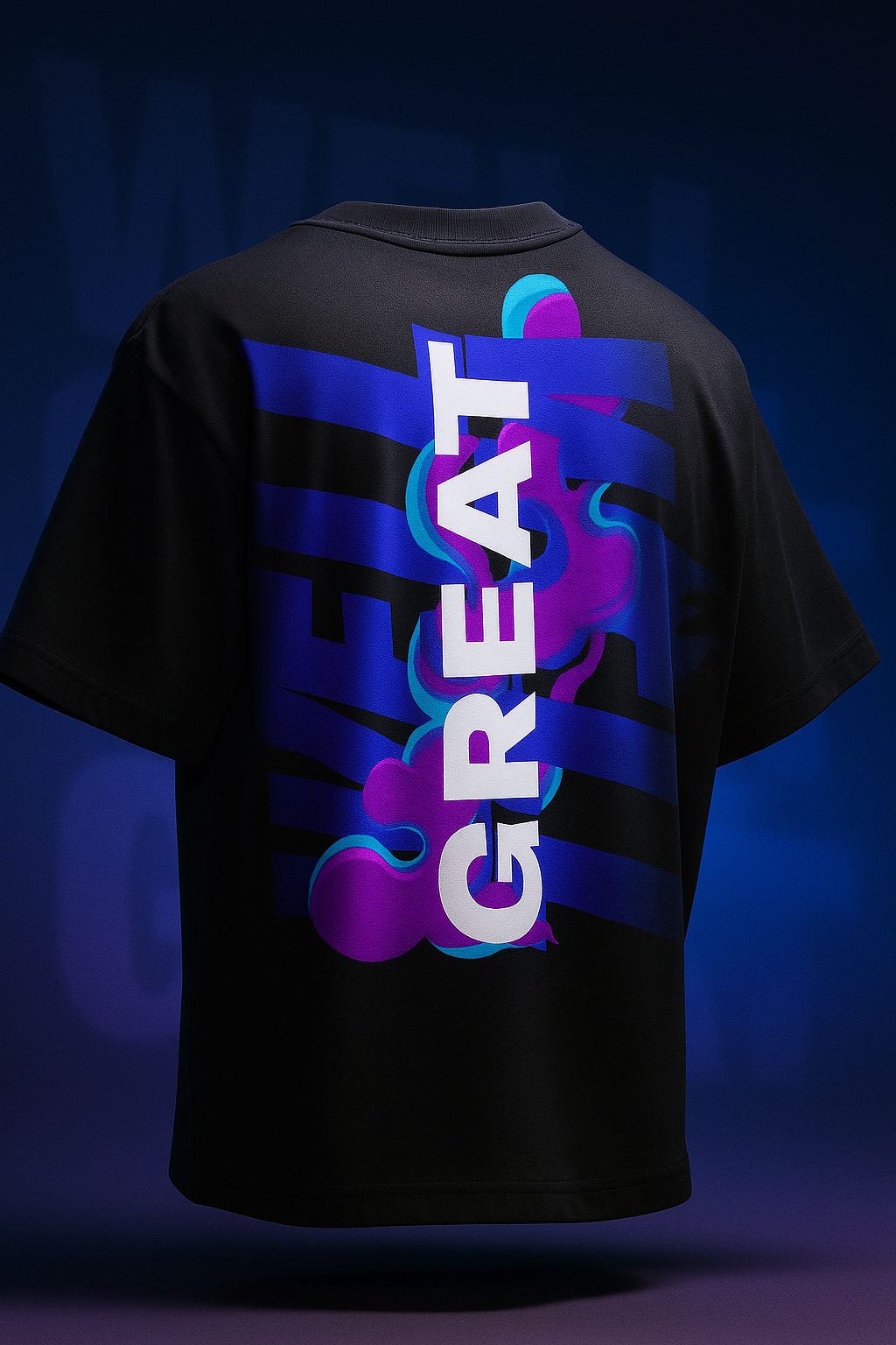 Make a confident statement with the WELL GREAT Oversized T-Shirt, crafted from 100% high-quality cotton for all-day comfort and a premium feel. The standout feature of this tee is its vivid graphic design on the back—featuring layered, sliced typography with a fluid mix of electric purple, aqua, and royal blue, brought to life with abstract flames and smooth gradients.
